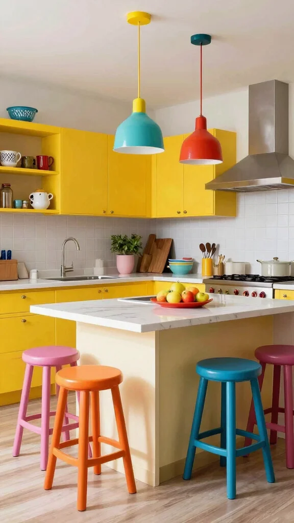 Bright colored fixtures inject joy into your kitchen, making it a delightful place to cook and socialize.