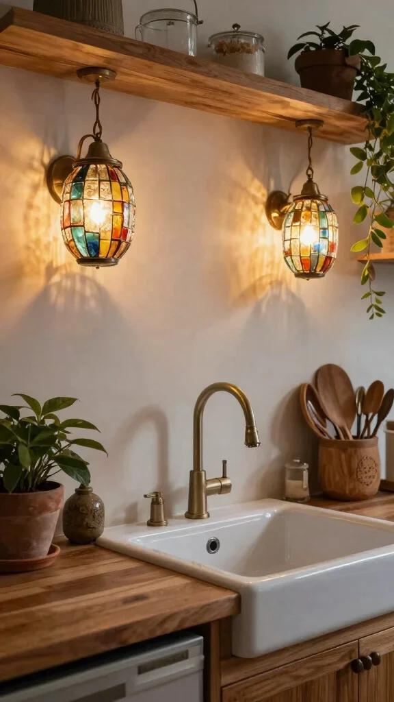 Recycled glass sconces can add a unique artistic touch to your kitchen while promoting sustainability. Available in various shapes and colors, these fixtures bring character to your sink area, creating a charming atmosphere. Installing sconces on either side of your sink can provide balanced light, beautifully illuminating the space while adding visual interest. Colored glass can cast intriguing shadows, enhancing the overall ambiance.