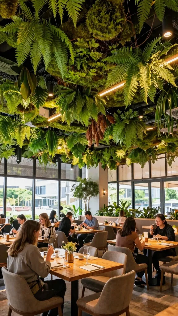 Envision dining beneath a lush ceiling filled with vibrant greenery! Living green ceilings not only beautify your restaurant but also purify the air, creating a refreshing atmosphere for your guests. By incorporating hardy plants like ferns or moss, you can craft an inviting environment that emphasizes sustainability and natural beauty.