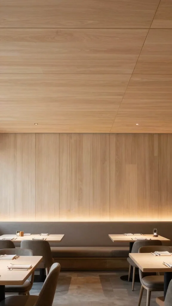 To maintain an airy feel, opt for light-colored wood or choose darker tones for a more dramatic ambiance. Pair minimalist wood paneling with soft lighting to create a cozy environment that encourages guests to unwind and enjoy their dining experience.