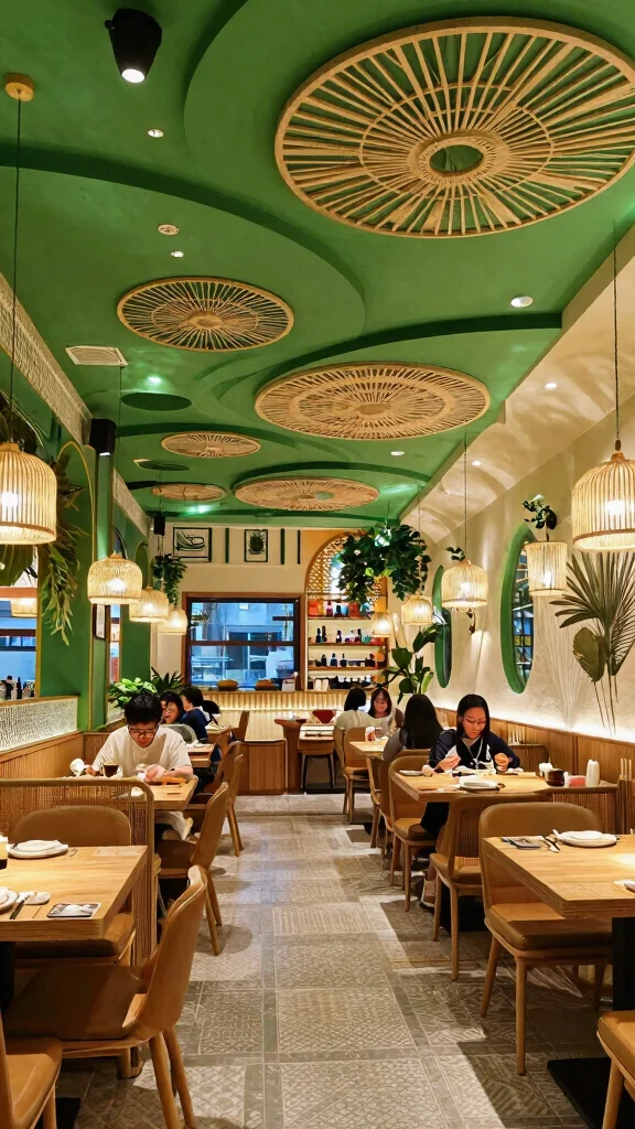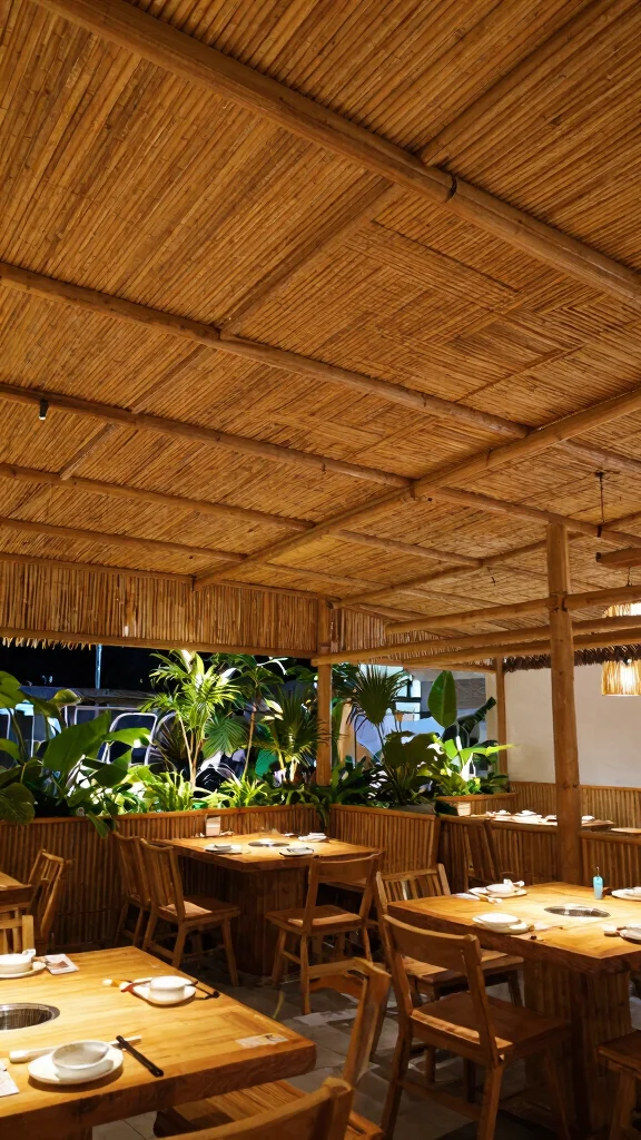 To enhance the organic vibe, pair bamboo ceilings with natural furnishings and plants, creating a serene dining environment. This approach is ideal for restaurants focused on healthy and sustainable living, appealing to eco-conscious diners.