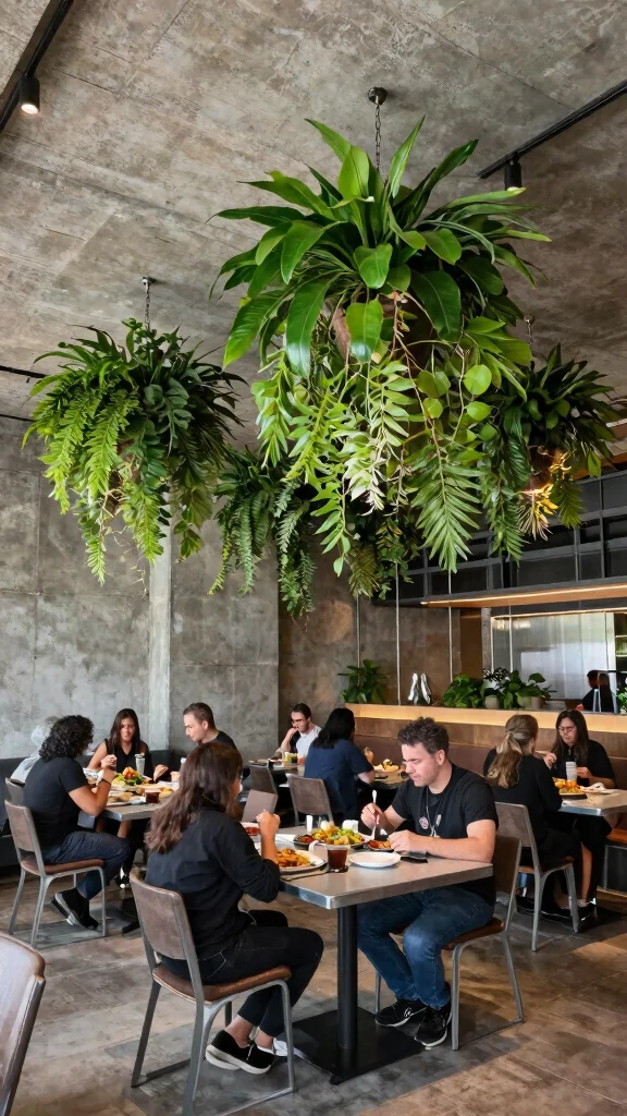 Concrete ceilings contribute an industrial character to your restaurant, creating a modern and edgy ambiance. To soften the starkness of concrete, incorporating green elements like hanging plants can create a stunning contrast that reflects a commitment to sustainability.