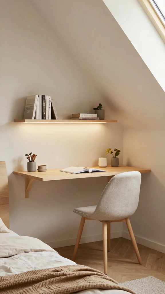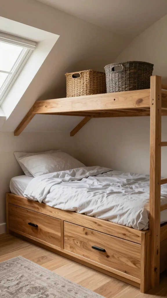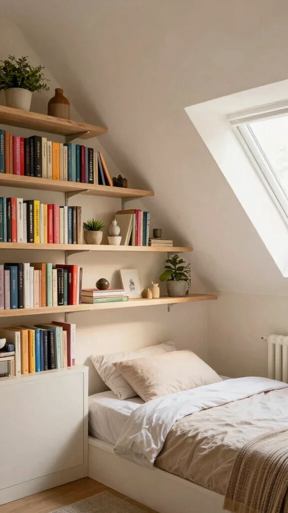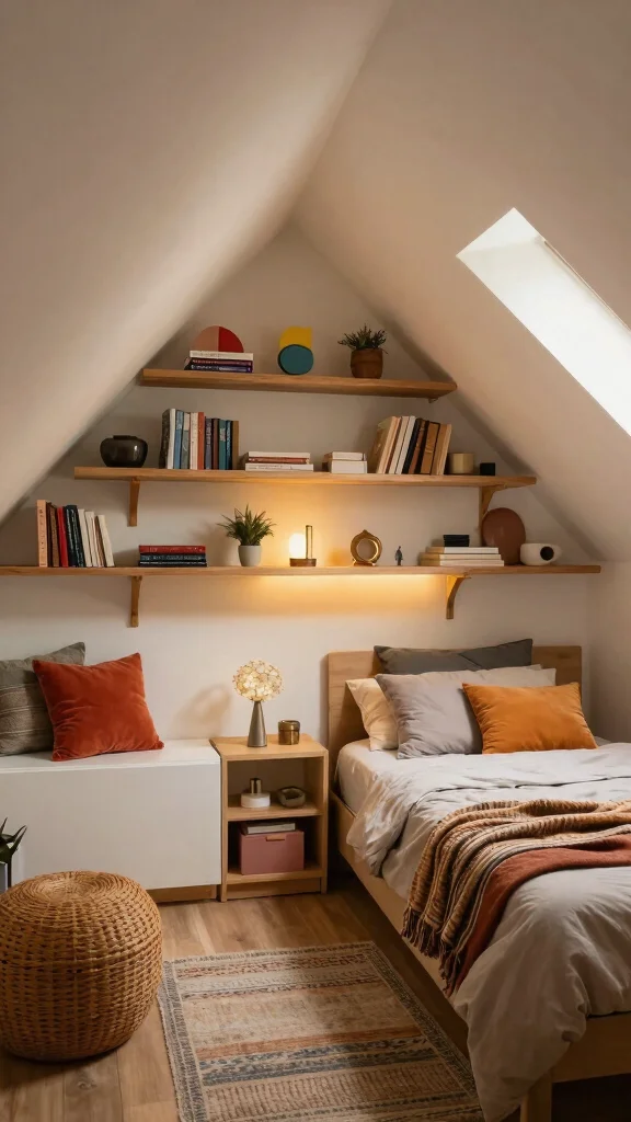 Use floating shelves or wall-hung units on the higher walls to reclaim floor space. Add a bench with hidden storage at the foot of the bed for seating and extra capacity. For creative attic storage, use shallow bins in alcoves and under-eave niches to keep smaller items organized.
