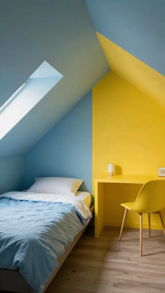In a small attic bedroom, defining zones for different activities is essential. One effective way to achieve this is by using color strategically. Painting distinct areas of the room in different colors can visually separate spaces for sleeping, working, or relaxing.