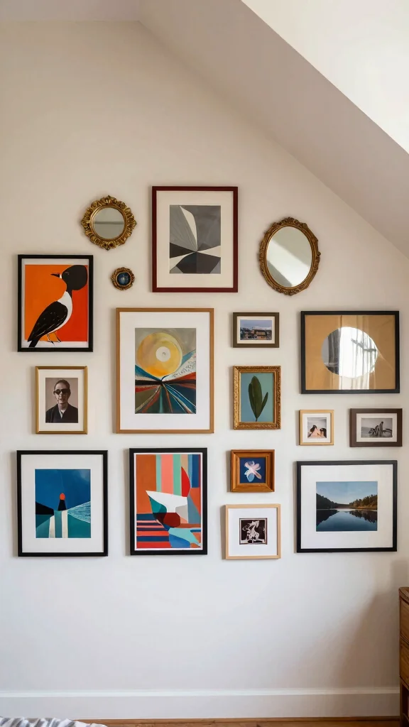 A gallery wall brings personality and flair to your sloped ceiling bedroom. Curating a collection of art, photographs, or decorative mirrors can draw the eye upward and showcase your creativity. Mix different frame sizes and styles to enhance visual interest while adding a personal touch.