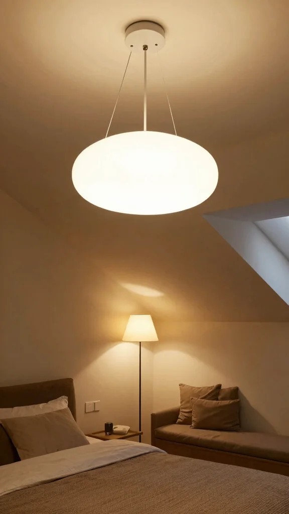 Layer lighting: install wall sconces on both sides of the bed for reading, add adjustable track lighting along the slope to highlight architecture, and use LED strip lights under the eaves for a soft glow.