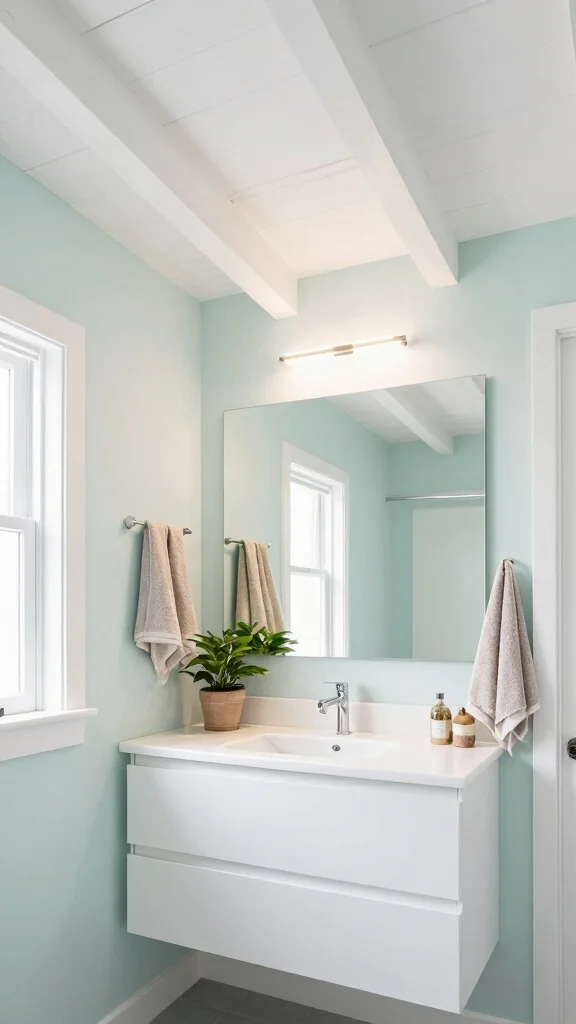 In small bathrooms, bright white beams can transform your space into a light-filled oasis. This design choice creates visual harmony by reflecting light, giving an illusion of spaciousness while adding rustic charm. Pairing these beams with soft-colored walls enhances the airy feel, making the bathroom welcoming and refreshing. Imagine white beams contrasting beautifully against pastel tiles or light gray paint, creating a serene atmosphere.
