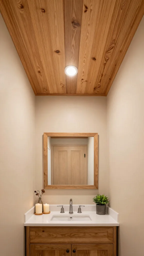 Incorporating a faux wood ceiling creates an inviting atmosphere, proving that even small spaces can have a significant visual impact.