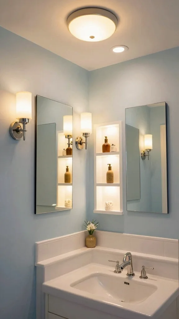 Use layered lighting techniques to create depth and ambiance in your small bathroom space.