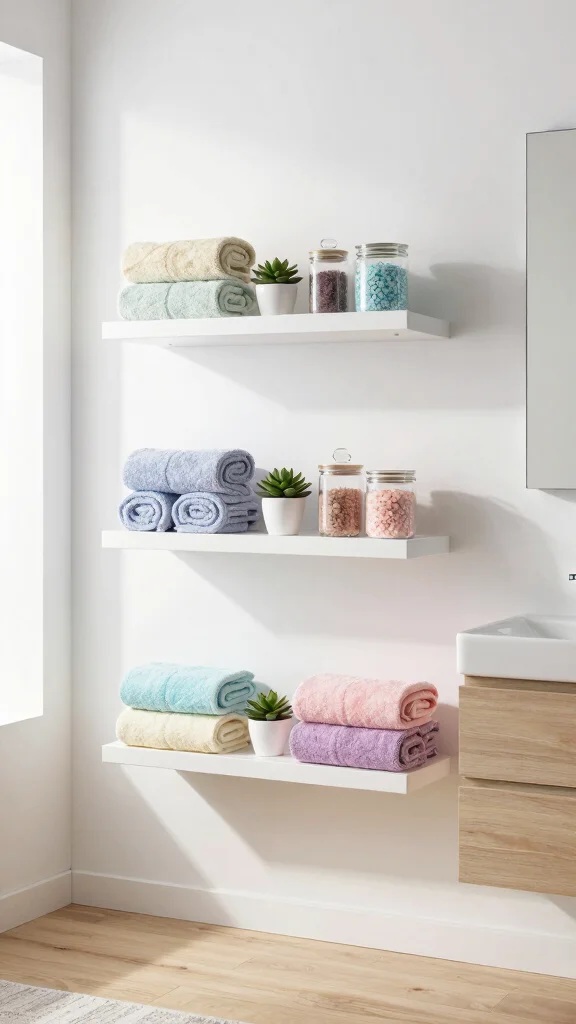 Fun fact: floating shelves can make a small bathroom feel about 15% larger by keeping sightlines open and reducing visual clutter. Stick to light-colored wood or white finishes to preserve that airy vibe, and use tidy jars or folded towels for a minimal, cohesive look.