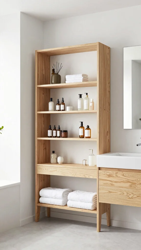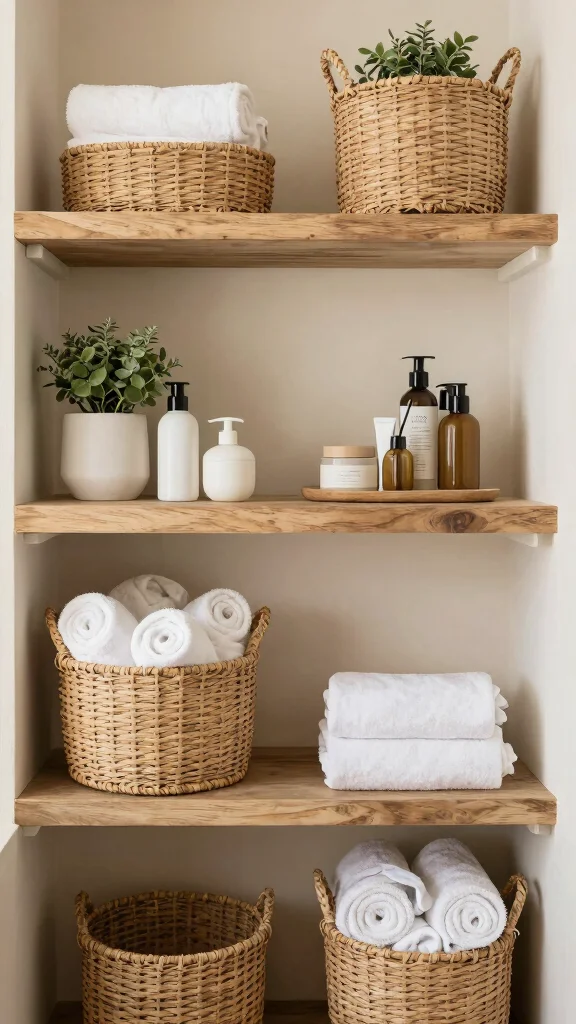 Use wall-mounted shelves with hidden brackets and a consistent finish to maintain clean lines, and tuck items into decorative storage baskets to keep bathroom organization intact.