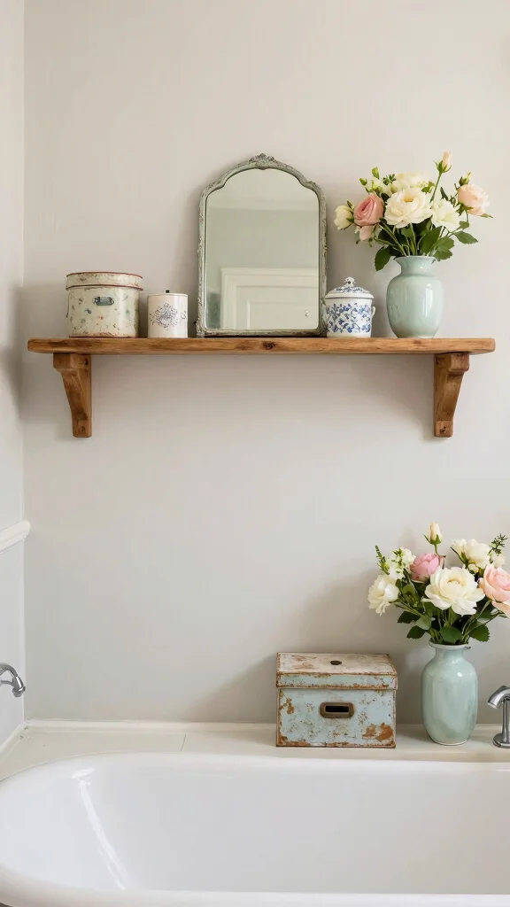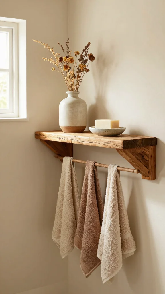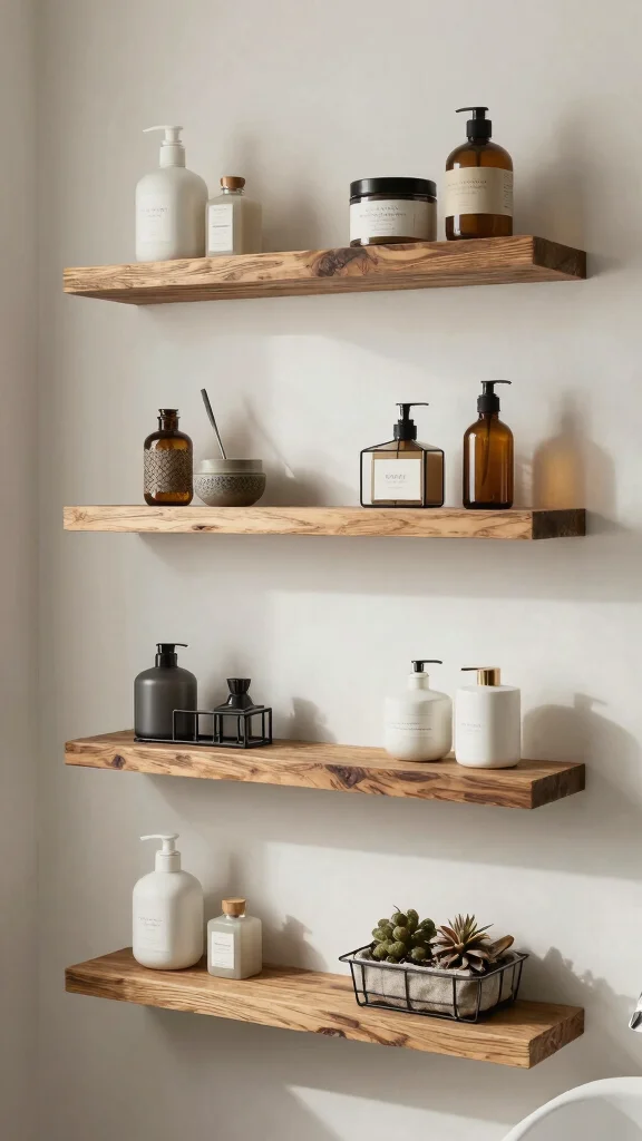 Keep the color palette neutral and let the wood texture stand out as a focal point within modern bathroom decor. Add a touch of greenery and simple metal accents to bridge rustic shelf ideas with sleek surfaces. Use one or two rustic shelves as statement pieces, and balance them with minimalist containers for decorative storage that remains cohesive.