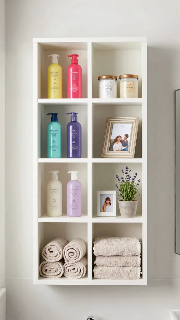 Turn shelves into dedicated zones: toiletries, towels, and décor.