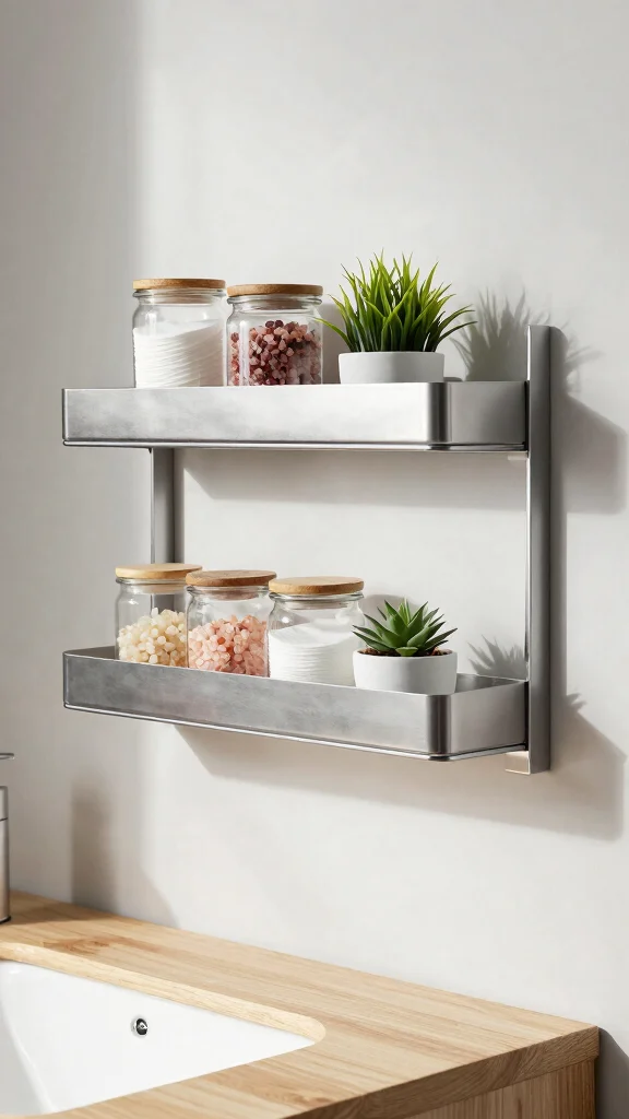 For those who appreciate an industrial edge, minimalist metal shelves can transform your bathroom. They provide sturdy storage options while effortlessly adding a modern touch to the space. Ideal for displaying toiletries or decorative accents, these shelves work beautifully alongside natural elements like plants.