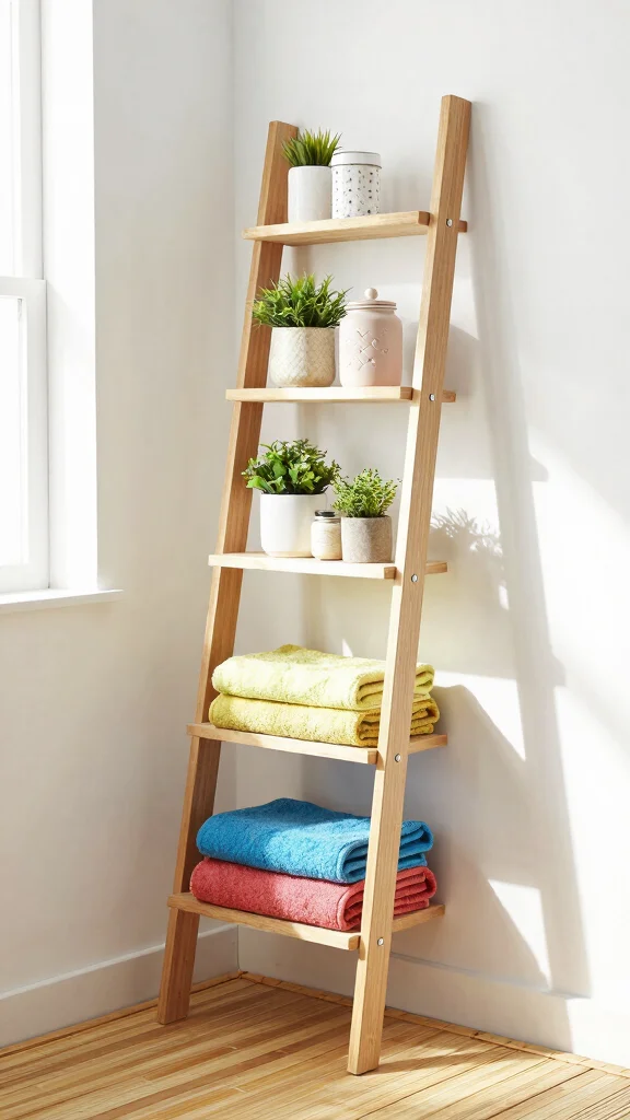 For a cohesive look, choose a wooden ladder for a rustic feel or a metal option for a modern twist. Decorate the shelves with plants cascading over the edges for a lively atmosphere, and use baskets on the lower shelves for discreet storage.