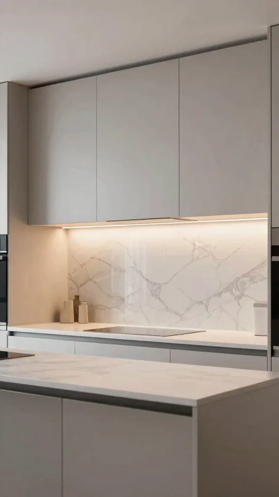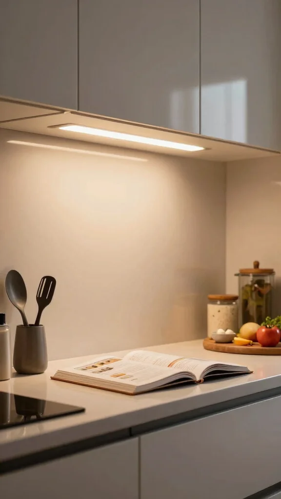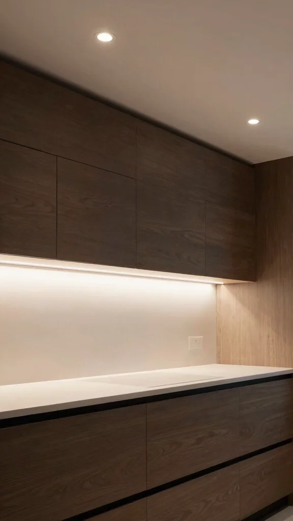 Layer light with slim under-cabinet LED strips and a central ceiling light to keep the space feeling open.