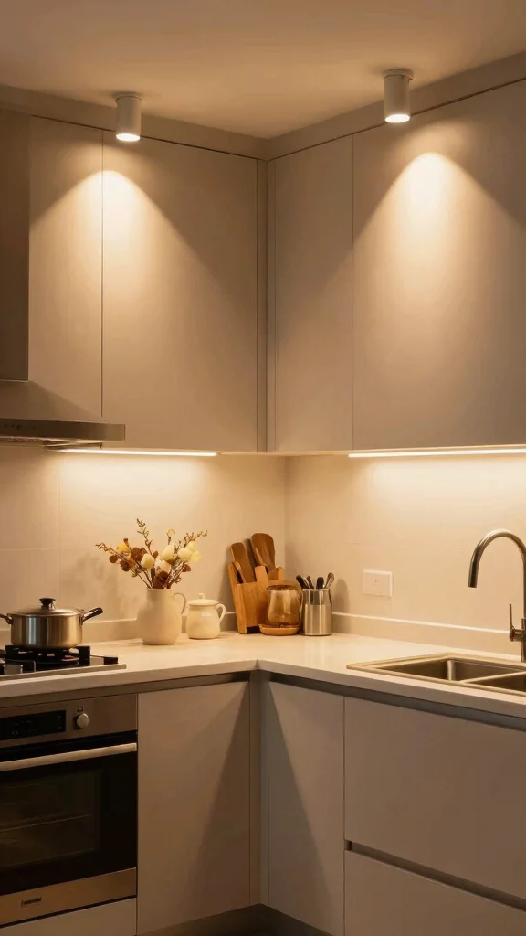 For functional kitchen decor, pair bright task lighting under cabinets with softer ambient lighting nearby.