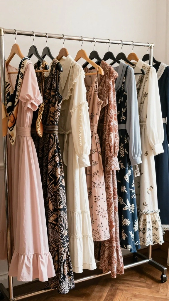 Showcase your stylish vintage collection right in your dressing room! Use this space not just for getting ready but as a display for your fashion treasures. Consider installing a curtain rod or dedicated clothing rack to showcase your favorite pieces, such as flowy dresses, hats, and scarves, adding visual interest and personality to the area.