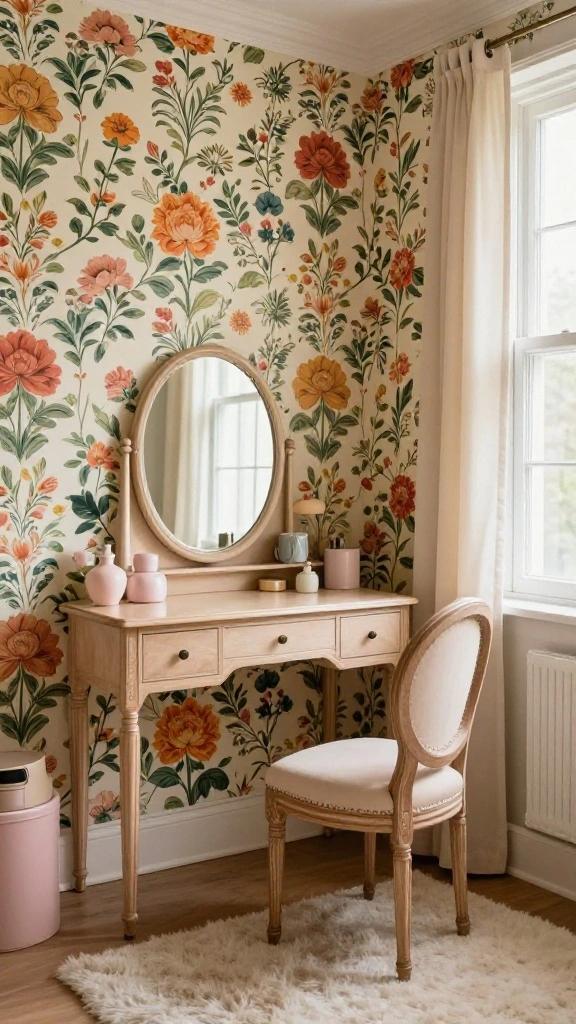 Revitalize your dressing room with whimsical wallpaper that brings life and personality to your walls. Vintage patterns, such as floral prints or retro geometric designs, can instantly set the tone, creating a cozy and inviting atmosphere. A bold statement wall adorned with vibrant wallpaper serves as an ideal backdrop for your vintage furniture, harmonizing beautifully with mirrors and dressers for a captivating look.