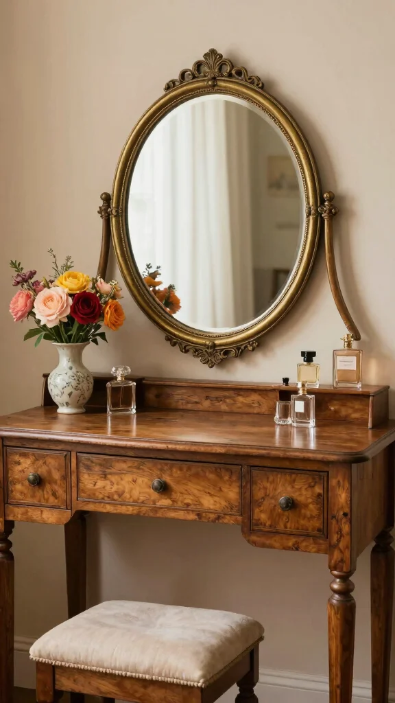 To complete the look, incorporate a brass-framed mirror and a classic stool, and accessorize with elegant perfume bottles, vintage jewelry trays, and your favorite skincare products.
