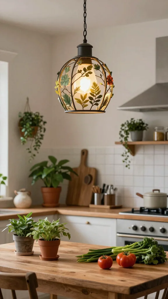 If you have a love for nature, botanical-inspired lights can bring organic design elements into your vintage kitchen. These fixtures often feature floral or leaf patterns that enhance the natural beauty of your cooking space, creating a harmonious connection to the outdoors. Choose options made from wrought iron or brass, adorned with botanical motifs for a fresh and inviting ambiance.