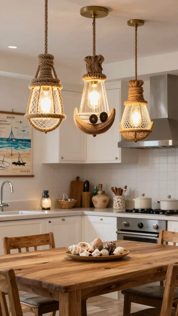 Choose weathered finishes to achieve an authentic look, and pair these fixtures with marine-inspired decor, such as nets or driftwood, for a cohesive theme. Warm lighting will help maintain a cozy vibe, making your kitchen feel welcoming and relaxed.