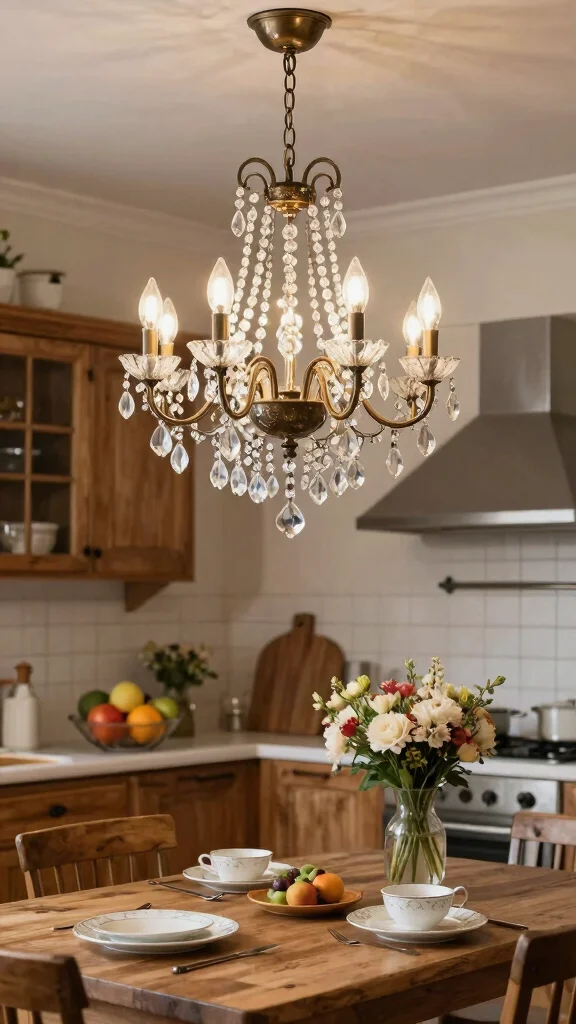 Elevate your kitchen’s atmosphere with an antique-style chandelier that radiates elegance and vintage charm. These stunning fixtures, crafted from materials like wrought iron or crystal, can transform a cozy kitchen into a sophisticated space, especially when hung low over tables or islands for maximum impact. The sparkling reflections of crystal can create a magical ambiance, perfect for intimate dinners or gatherings.
