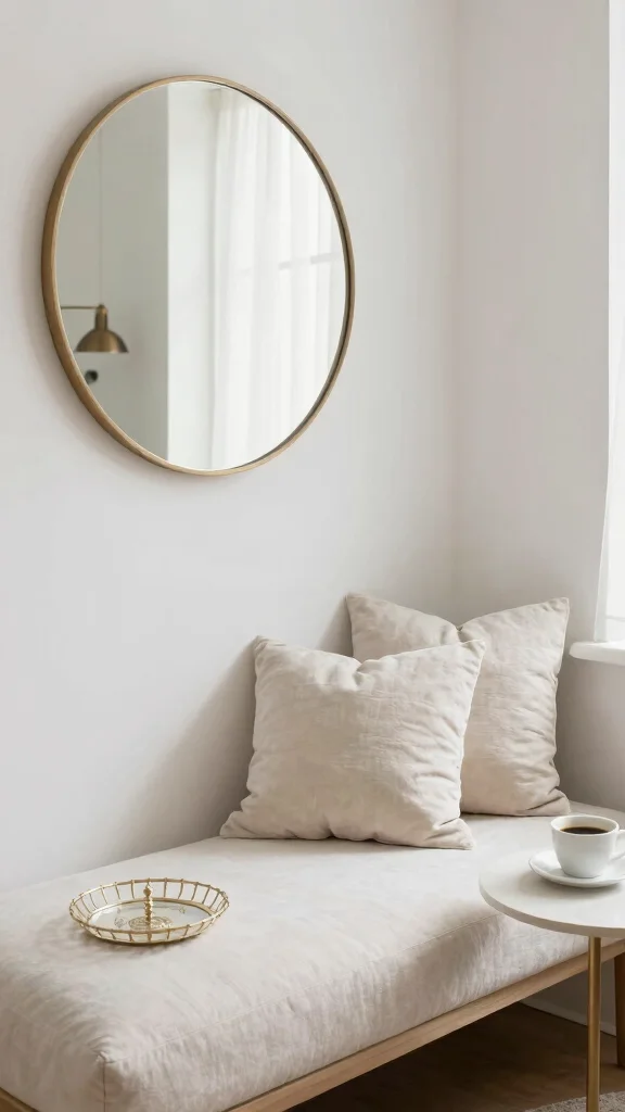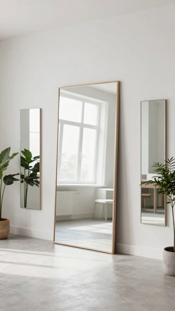 Use large, minimalist mirrors to enhance light and create a sense of spaciousness in your white dressing room.