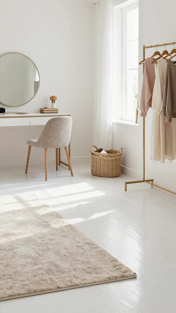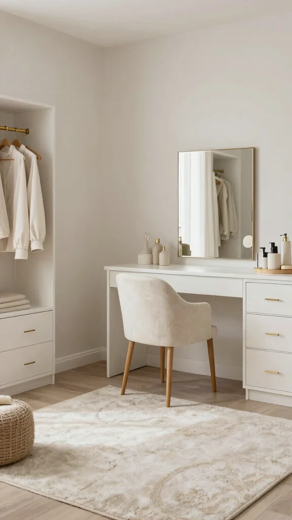 Bring in color with carefully chosen accessories—pillow tones, a soft curtain, or a rug—so you maintain white dressing room balance.