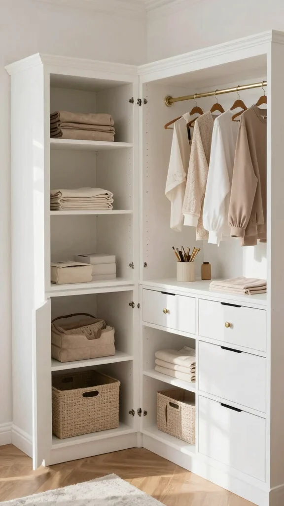 Fun fact: in a white dressing room, using clear containers and tall shelves can boost perceived space by up to 30%. Pair it with stylish baskets for accessories and open shelving to display favorites, keeping the room bright, organized, and effortlessly chic.
